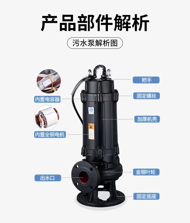 產(chǎn)品說明:南方wq污水污物潛水電泵由電機(jī)與泵兩部分組成,兩者通過油室及機(jī)械密封組件隔開,分固定式自動(dòng)耦合安裝和移動(dòng)安裝。